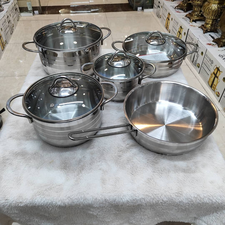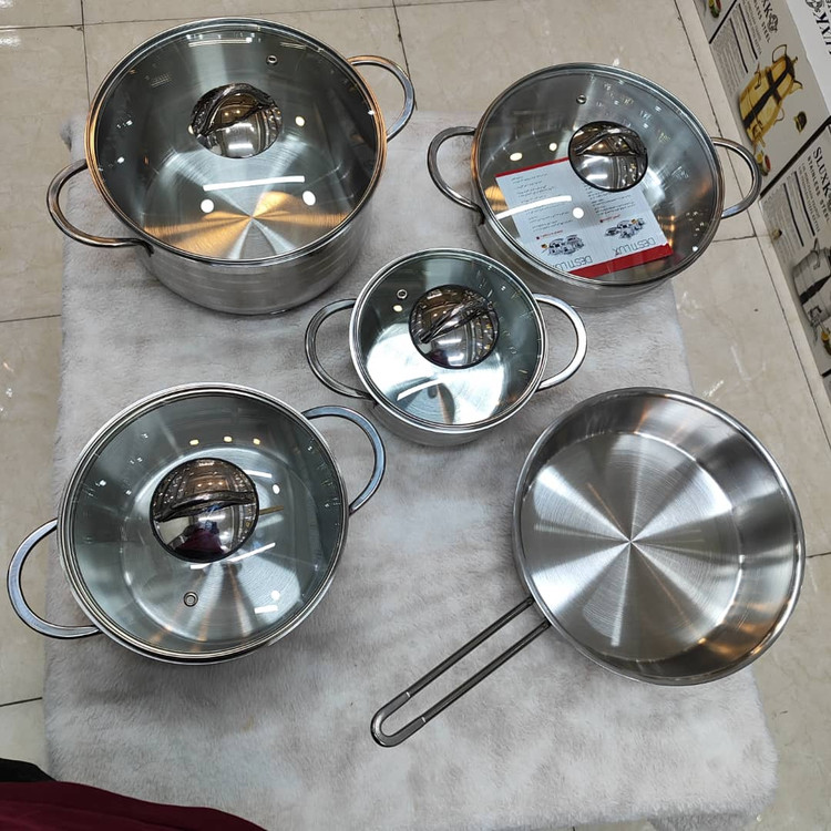 دارای 3 قابلمه به سایزهای 32 و 28 و 20 و دو تابه ی 28 و 30 دربدار و ارزانترین سرویس قابلمه استیل و کف چدن و نچسب: 1
