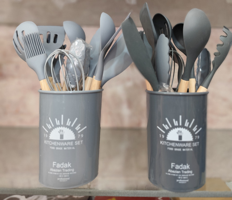 دارای کفگیر و ملاقه و انبر و برگردان تخت و قاشق ماکارونی و فرچه و قاشق و همزن و لیسک و برگردان و قاشق سوراخدار